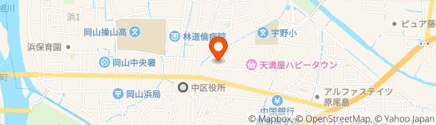 高速道路岡山ICを下車し、岡山北バイパスを市街地に進み突き当たりを左折そのまま直進し、岡北大橋渡り旭川を越えます。そのまま道なりに進み 浜三丁目交差点を左折し、左手の岡山スバル自動車を左折して50mくらいです。ミサオヤマビル1F青いドアが目印です。